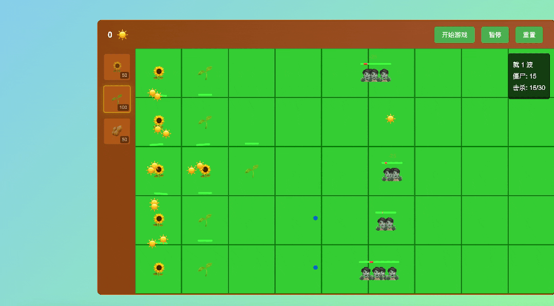 最后我索性簡化了 “ 第X波 ” 的邏輯,改成了 “ 就1波 ”,游戲開始后就直接出現 30 個僵尸,全部擊殺完就勝利。這期間也順便讓 K2 修復了僵尸位置沒有跟網格對齊的問題,堅果墻不能阻擋僵尸前進的問題,僵尸攻擊的距離判定問題,豌豆射手的豌豆顏色問題等等。